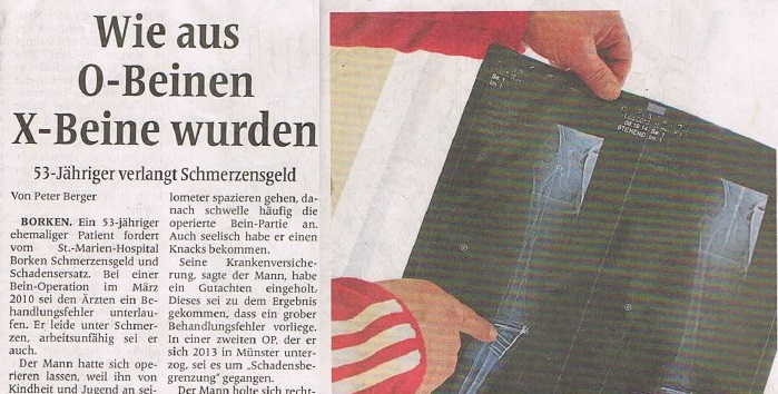 Der Orthopäde hatte bei seiner Operation einen Laser eingesetzt. "Diese Methode ist für derartige Eingriffe unüblich", so Anwältin Diehl. "Zudem vermuten wir, dass er den Laser völlig ungeübt oder falsch benutzt hat, denn das Gewebe war verbrannt und ein Band im Knie durchtrennt. Die Folgen waren die Nekrose."