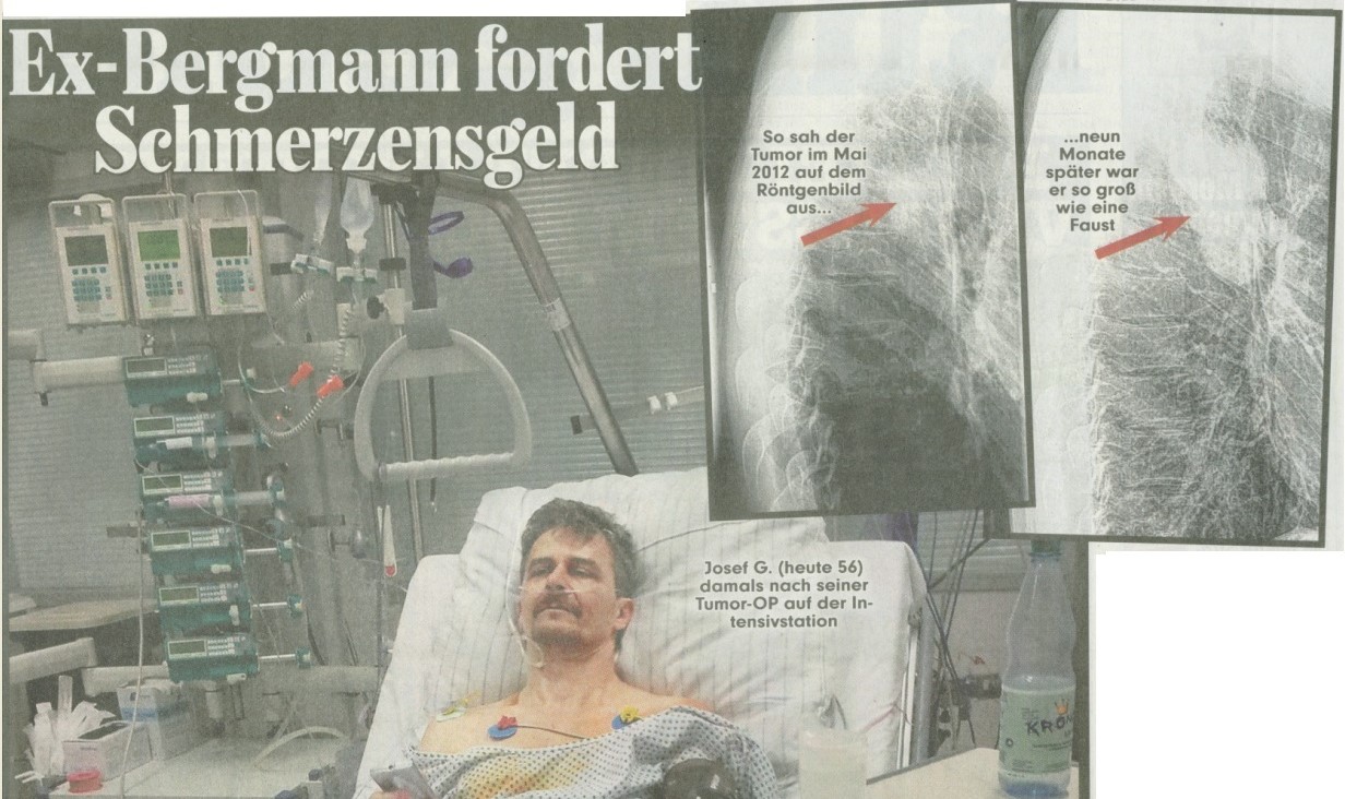 Der ehemalige Bergmann wird operiert, doch die Chemo muss wegen Unverträglichkeit abgebrochen werden. Der Krebs hat da bereits gestreut, bis in die Leber. Josef G.: „Ich habe starke Schmerzen, will aber Gerechtigkeit für meine Familie, wenn durch meinen Tod eine Lücke entsteht!“
